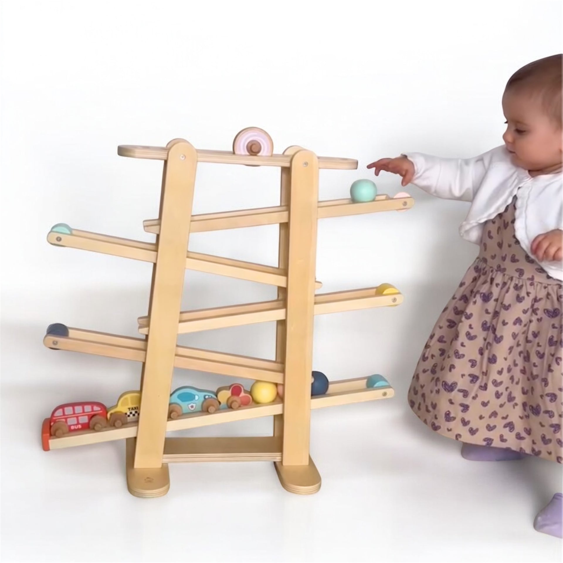 Diese wunderschöne Holz-Kugelbahn ist das perfekte Spielzeug, um kleinen Entdeckern stundenlangen Spielspaß zu bieten. Sie ist nicht nur ein echter Hingucker, sondern fördert auch spielerisch die motorischen Fähigkeiten, die Konzentration und das logische Denken deines Kindes.